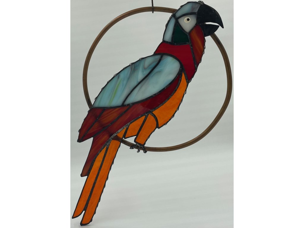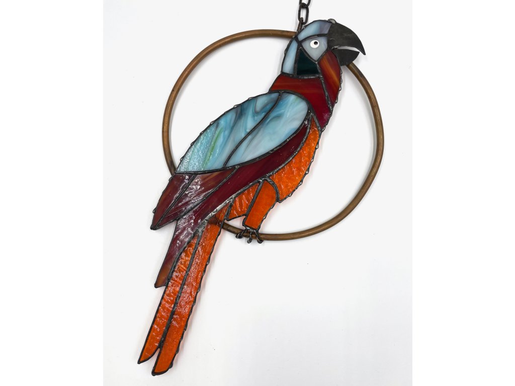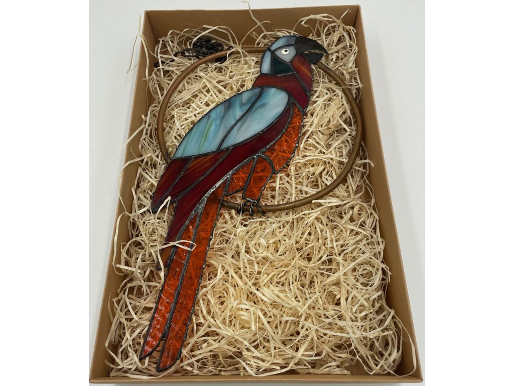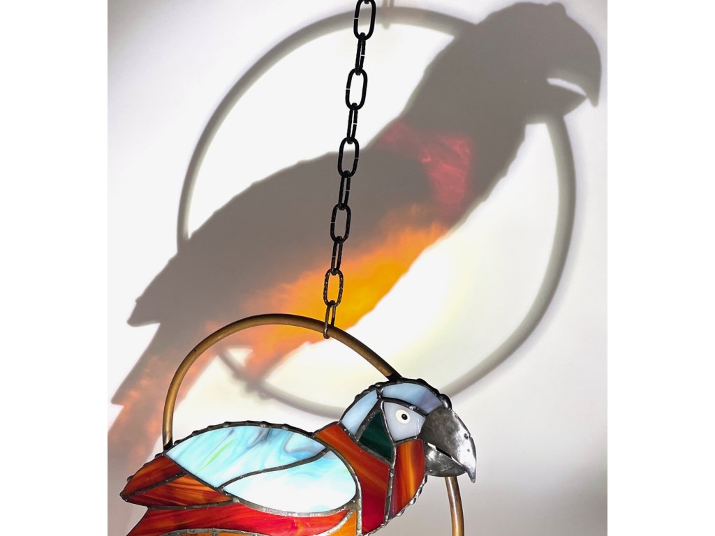 Papušek je vytvořen technikou Tiffany. Použila jsem výrazná barevná skla, která nejlépe vyniknou na okně, kde má slunce možnost vykouzlit krásné barevné stíny.