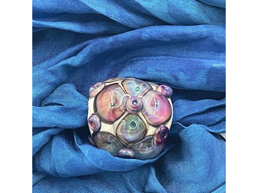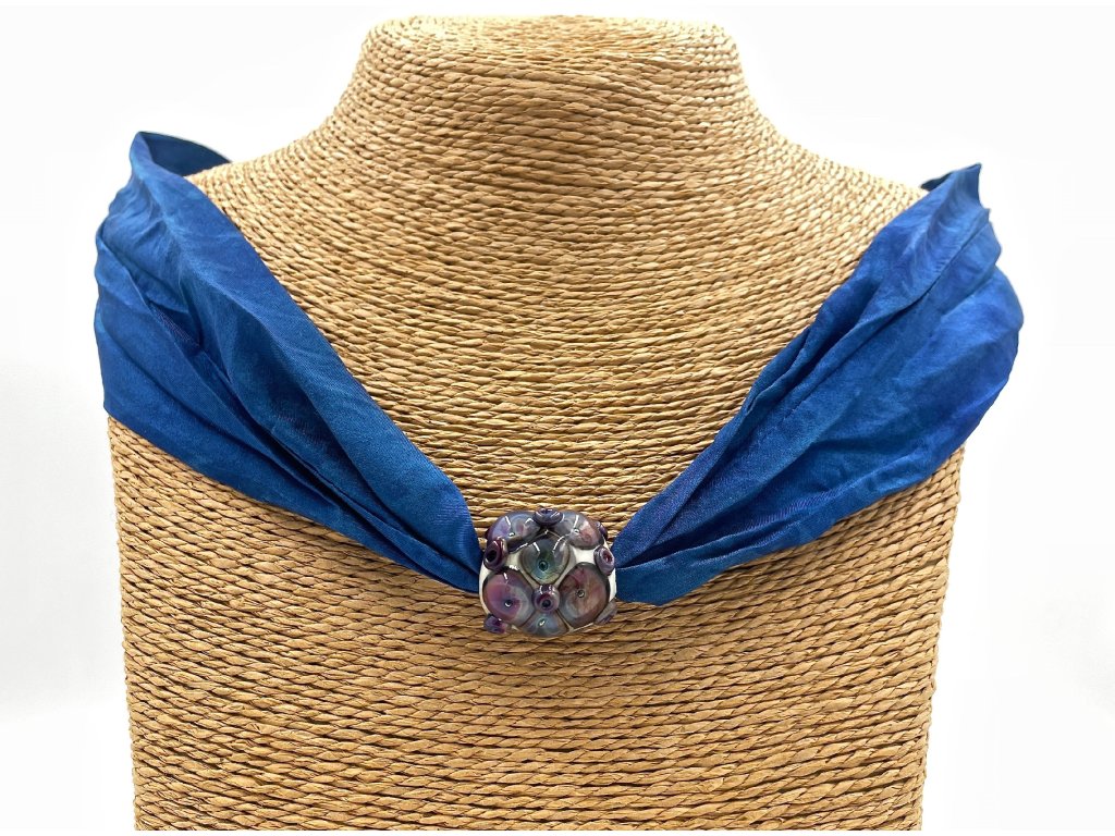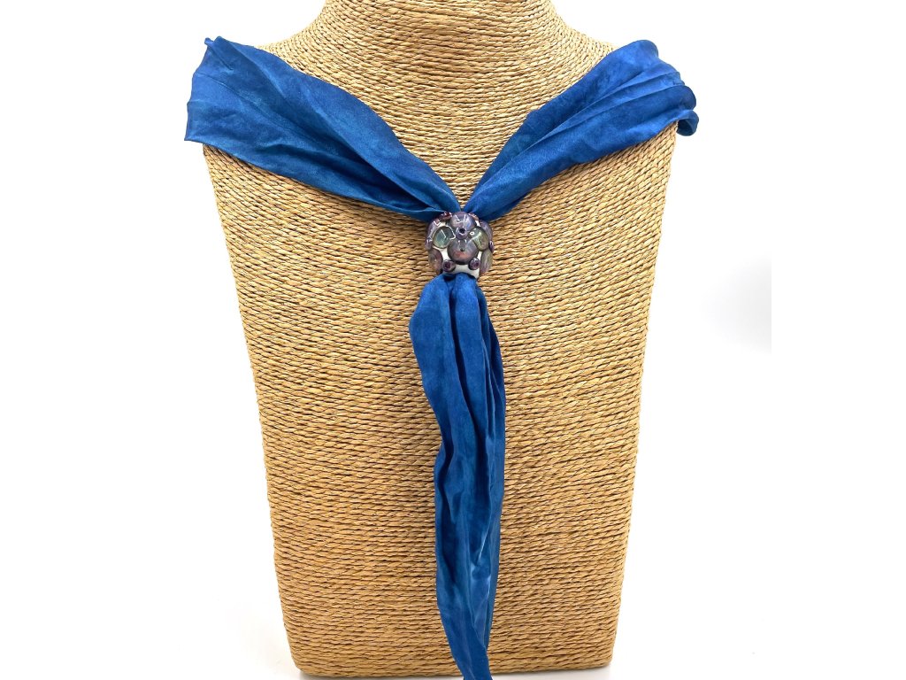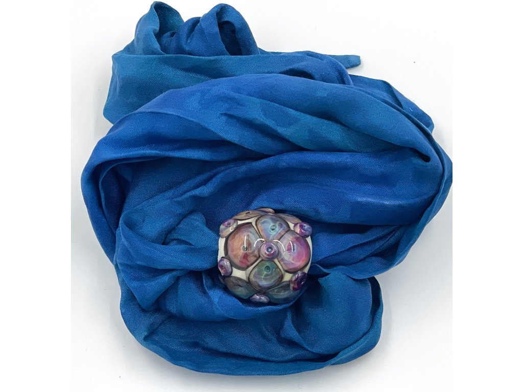 Vinutá perla je navlečena na šátku ušitém z pravého hedvábí (pongé 5) a obarveném profesionálními napařovacími barvami.