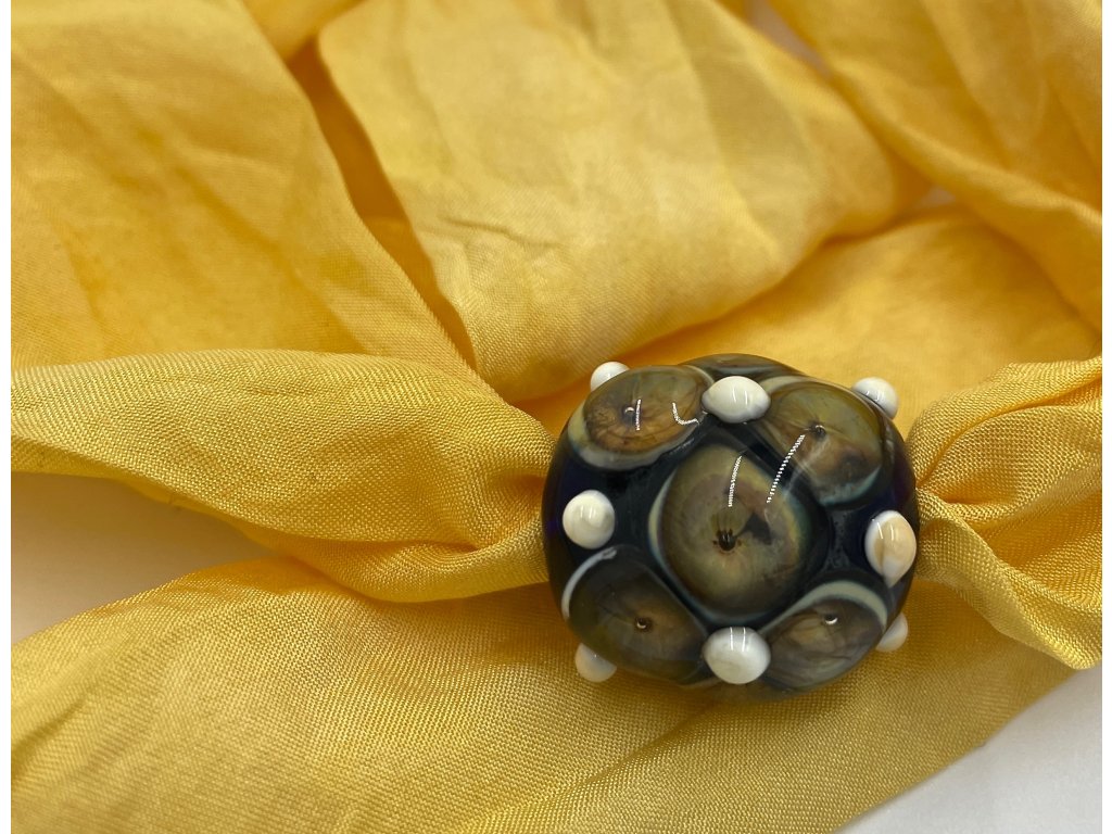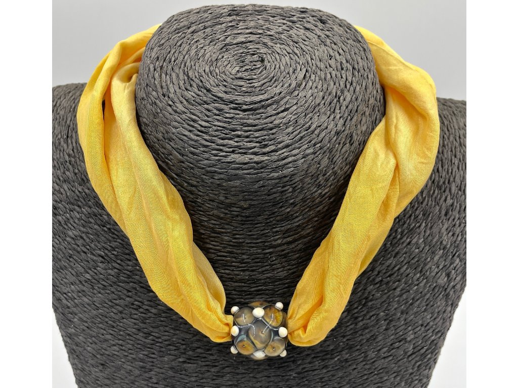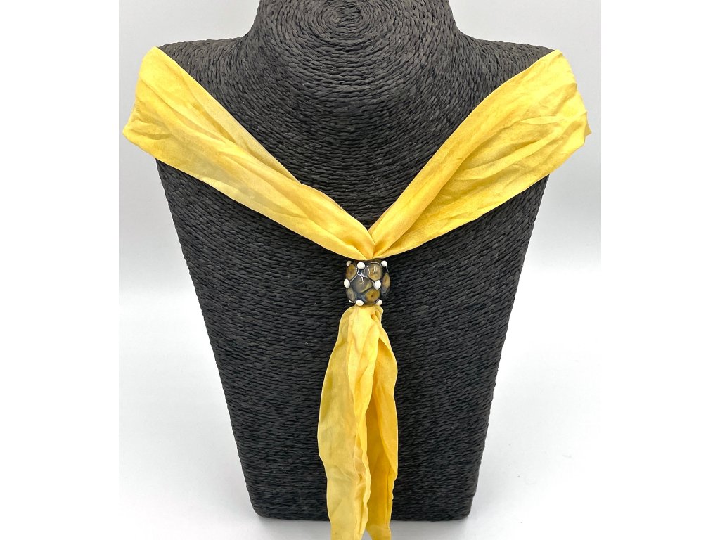 Vinutá perla je navlečena na šátku ušitém z pravého hedvábí (pongé 5) a obarveném profesionálními napařovacími barvami.